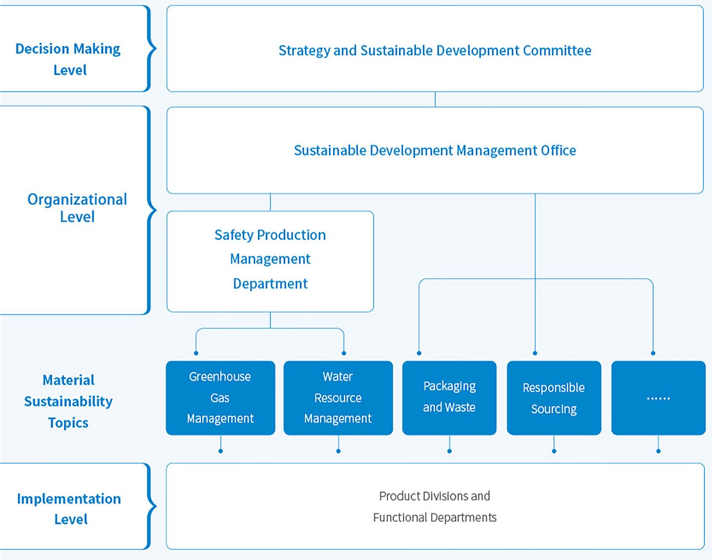 Yili has established a Strategy and Sustainable Development Committee at the board level, which is composed of eight directors (including two independent directors), under the charge of Mr. Pan Gang, the Chairman and President of Yili. Apart from business development strategy, the Committee also focuses on researching and recommending sustainability strategic plans for Yili's long-term development. The Committee also oversees its sustainability strategy implementation across the company (including water resource management). The Sustainable Development Office is under Strategy and Sustainable Development Committee, which is responsible for the sustainability performance supervision and report to the Strategy and Sustainable Development Committee on a regular basis. The Safety Production Management Department of Yili is responsible for day-to-day management of water resources. The quarterly progress reports are submitted to the Sustainable Development Management Office for review and monitoring purposes.
