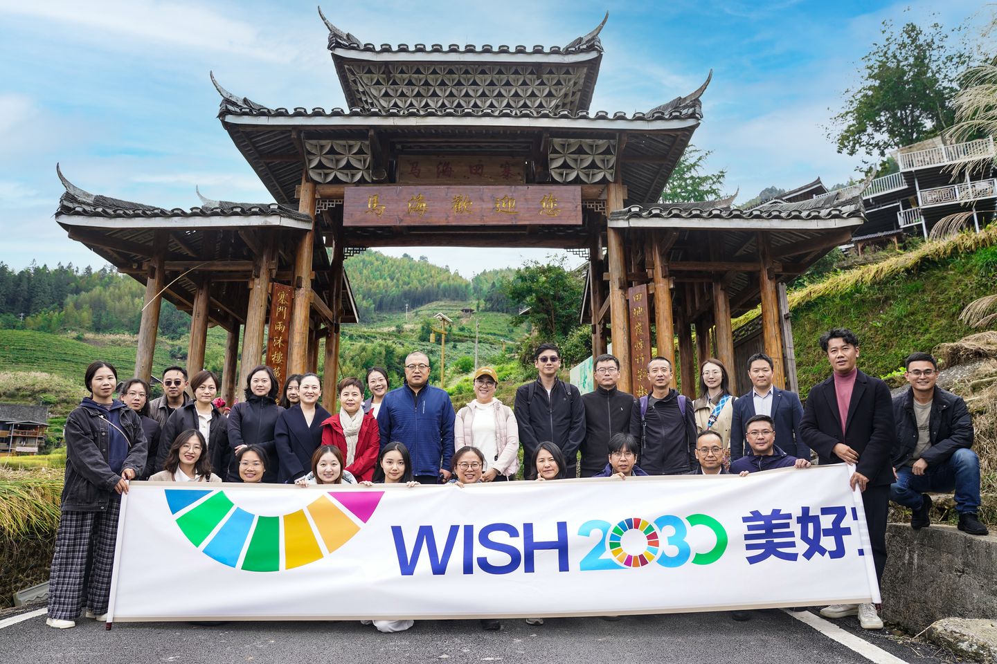 可持续社会价值生态圈伙伴与嘉宾们在马海村合影留念,共同“让美好发声”